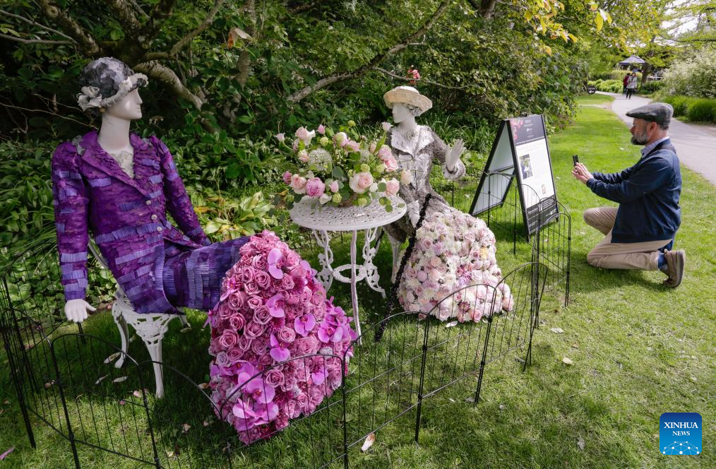 A visitor takes photos of a floral mannequin on display during the 2025 Fleurs de Villes DOWNTON ABBEY exhibition at VanDusen Botanical Garden in Vancouver, British Columbia, Canada, May 23, 2025. Featuring over 20 floral installations created by local florists, the event is held here from May 23 to June 1 this year. (Photo by Liang Sen/Xinhua)