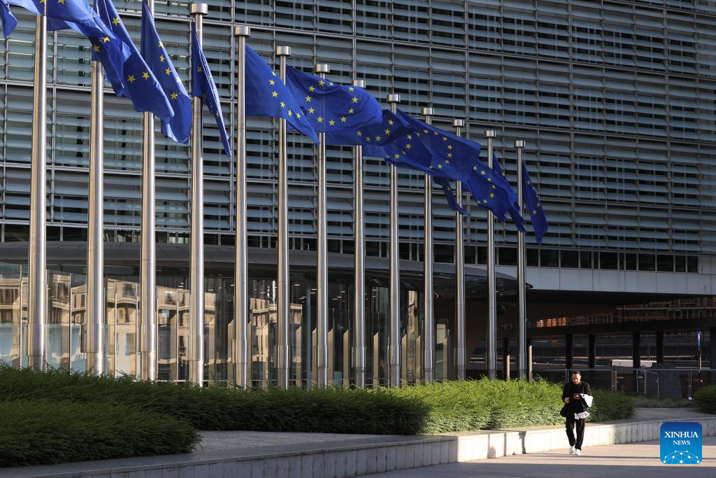 Photo taken on May 23, 2025 shows European Union flags at the European Commission headquarters in Brussels, Belgium. U.S. President Donald Trump on Friday threatened a 50 percent tax on all imports from the European Union as well a 25 percent tariff on Apple products unless iPhones are made in the United States. (Xinhua/Zhao Dingzhe)
