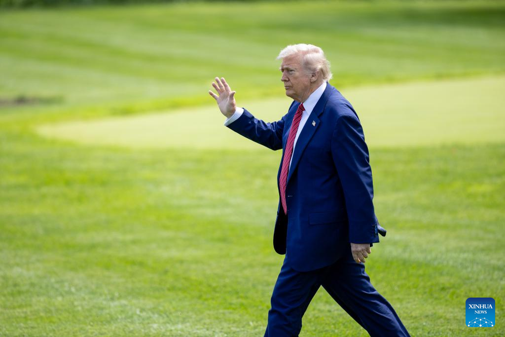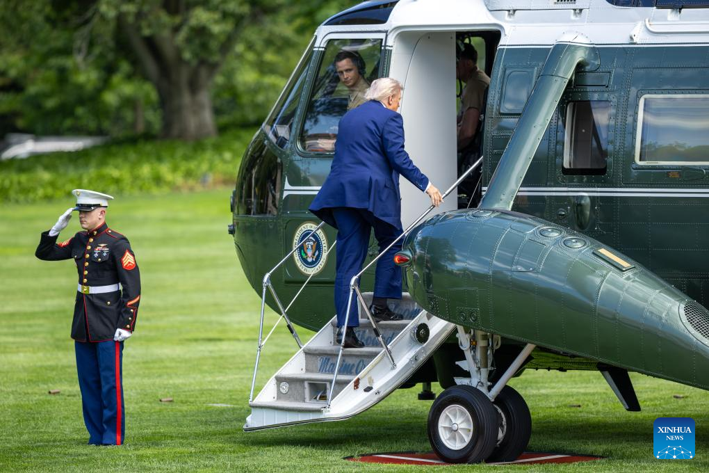 U.S. President Donald Trump boards Marine One at the White House in Washington, D.C., the United States, on May 23, 2025. U.S. President Donald Trump on Friday threatened to impose tariffs on Samsung and other smartphone producers, following an earlier announcement targeting Apple. (Xinhua/Hu Yousong)