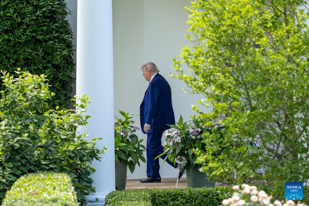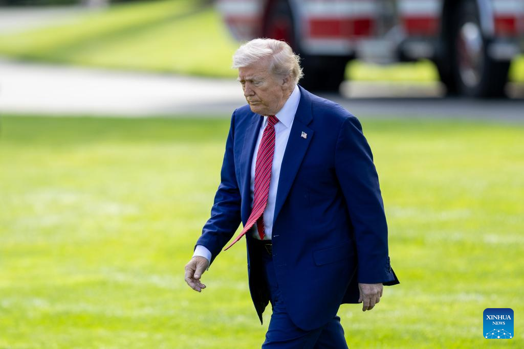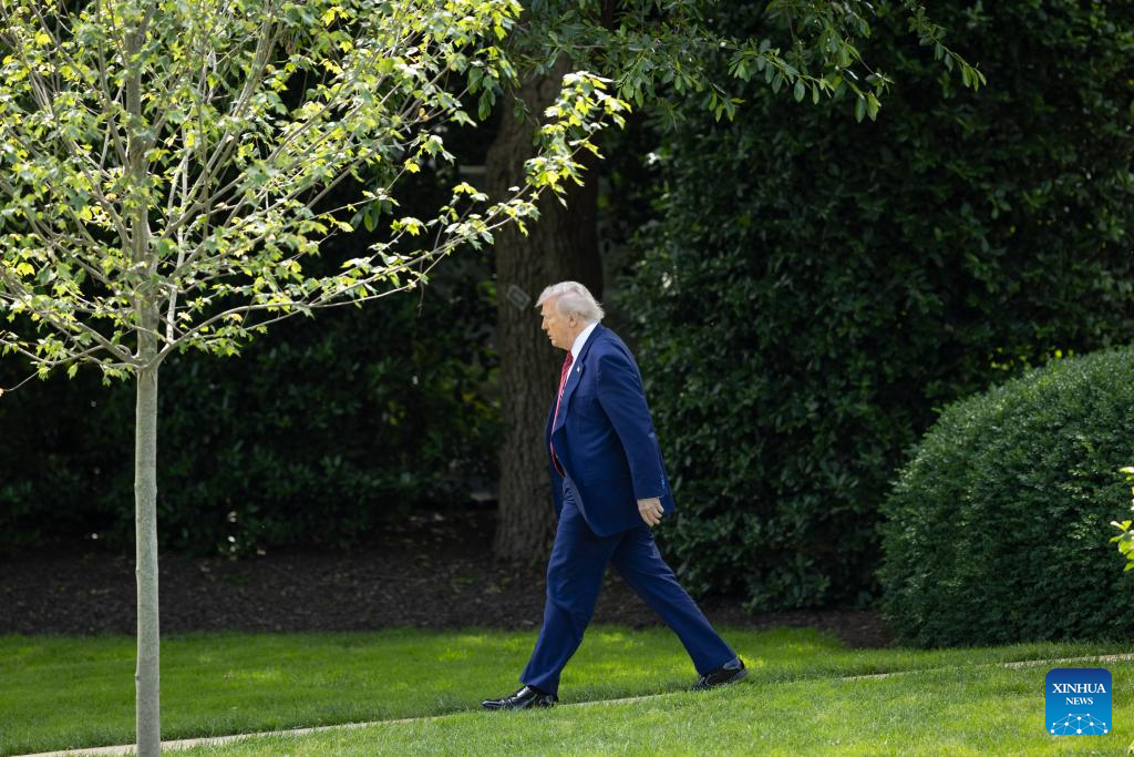 U.S. President Donald Trump walks to board Marine One at the White House in Washington, D.C., the United States, on May 23, 2025. U.S. President Donald Trump on Friday threatened to impose tariffs on Samsung and other smartphone producers, following an earlier announcement targeting Apple. (Xinhua/Hu Yousong)