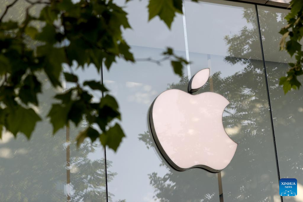 Photo taken on May 23, 2025 shows the logo of an Apple store in Brussels, Belgium. U.S. President Donald Trump on Friday threatened a 50 percent tax on all imports from the European Union as well a 25 percent tariff on Apple products unless iPhones are made in the United States. (Xinhua/Zhao Dingzhe)