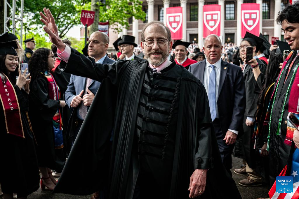Harvard University President Alan Garber interacts with students during commencement ceremony at Harvard University in Cambridge, Massachusetts, the United States, May 29, 2025. A U.S. federal judge on Thursday extended a Temporary Restraining Order on Trump Administration's policy that aimed to prevent Harvard University from enrolling international students.