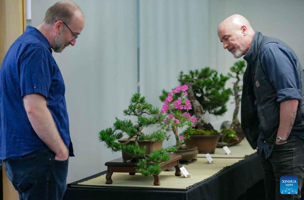 Visitors view bonsai works on display during the BC Bonsai Show in Surrey, British Columbia, Canada, May 31, 2025. The two-day annual show, which featured about 50 bonsai works created by local artists, attracted bonsai enthusiasts to visit and exchange techniques. (Photo by Liang Sen/Xinhua)