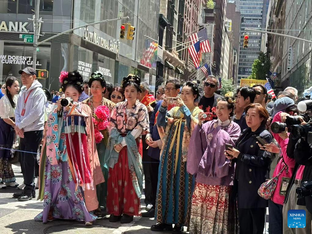 People in traditional Chinese costumes take part in a celebration of Asian American and Pacific Islander (AAPI) Heritage Month in New York, the United States, on June 1, 2025. (Photo by Qin Mingwei/Xinhua)