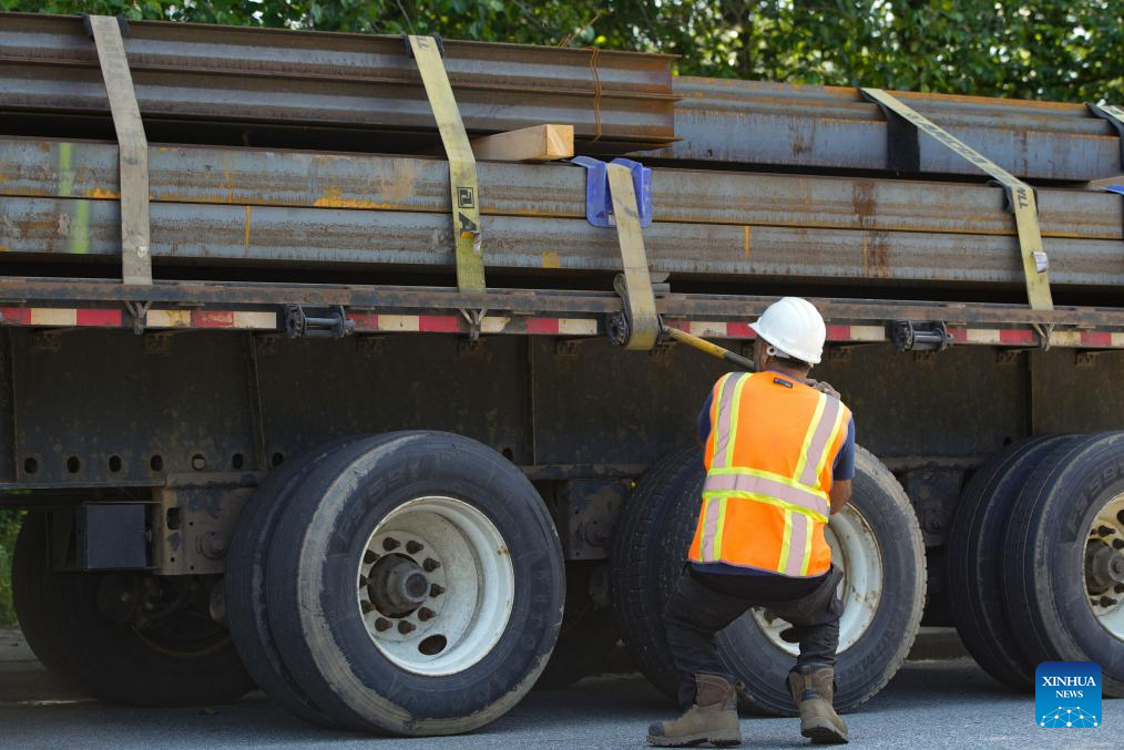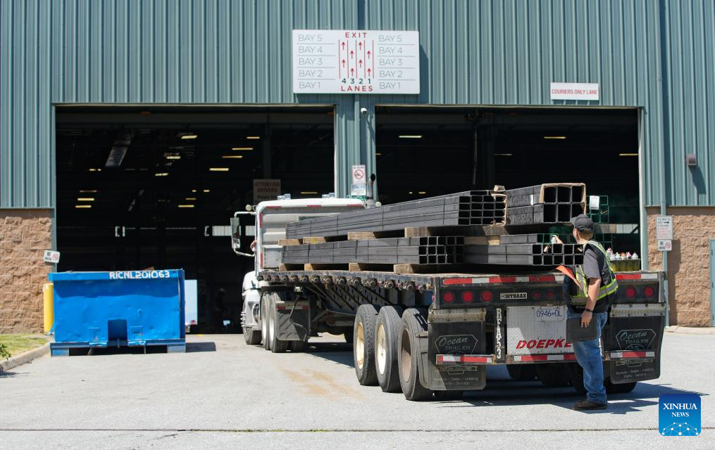 A worker secures steel products loaded on a truck at a steel supplier's facility in Delta, British Columbia, Canada, June 3, 2025. The United States started to raise tariffs on imported steel and aluminum from 25 percent to 50 percent starting from Wednesday, according to an executive order signed by U.S. President Donald Trump on Tuesday. (Photo by Liang Sen/Xinhua)