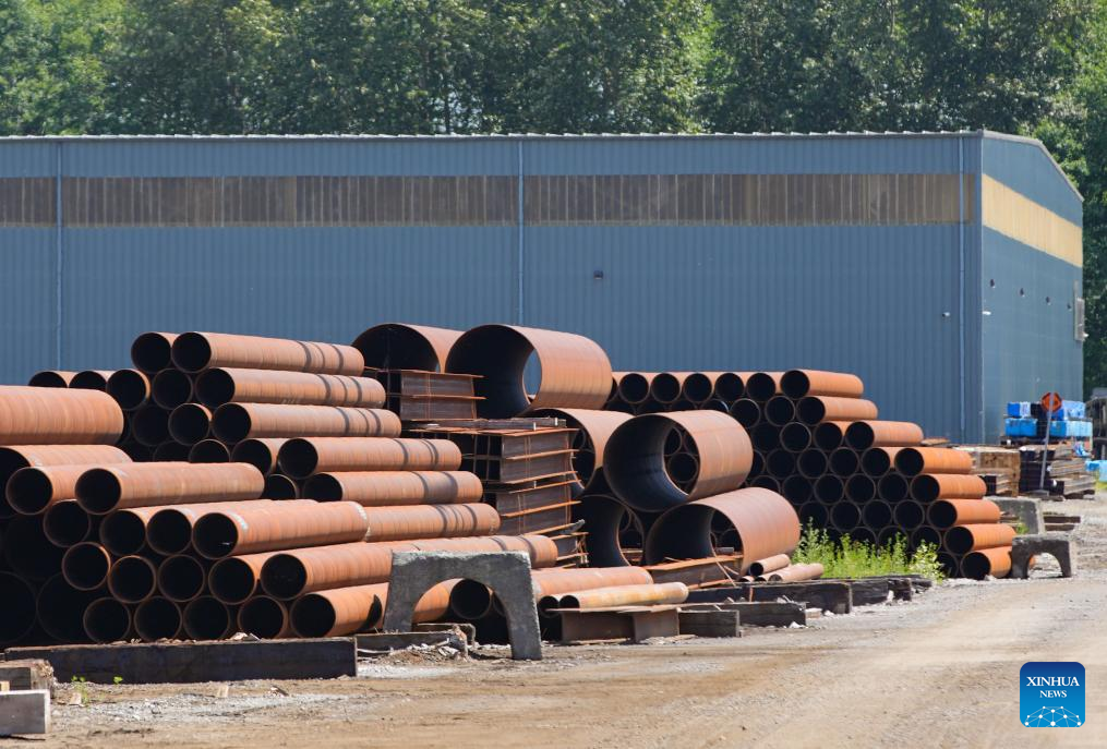 Steel pipes are seen at a steel supplier's facility in Delta, British Columbia, Canada, June 3, 2025. The United States started to raise tariffs on imported steel and aluminum from 25 percent to 50 percent starting from Wednesday, according to an executive order signed by U.S. President Donald Trump on Tuesday. (Photo by Liang Sen/Xinhua)