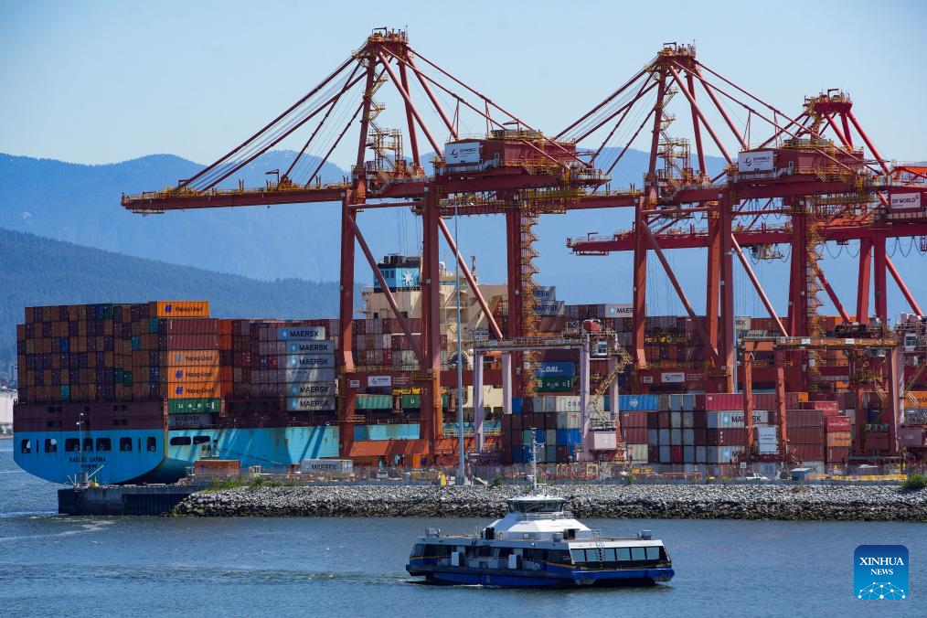 This photo taken at the Port of Vancouver shows a container ship loaded with containers at the Centerm container terminal, Vancouver, Canada, June 5, 2025. Canada's merchandise trade dropped in April with the trade deficit hitting a record high, Statistics Canada said Thursday. Exports dropped 10.8 percent while imports fell 3.5 percent. As a result, Canada's merchandise trade deficit with the world widened to 7.1 billion Canadian dollars (5.2 billion U.S. dollars) in April. This was the largest deficit on record, said the national statistical agency. (Photo by Liang Sen/Xinhua)