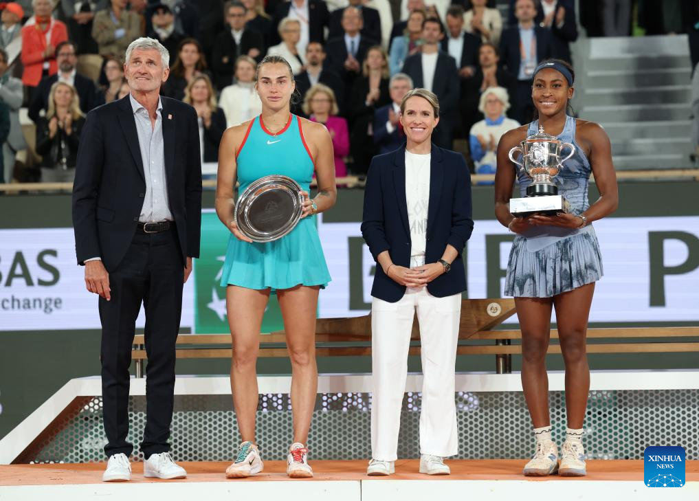 Winner Coco Gauff (1st R) and runner-up Aryna Sabalenka (2nd L) pose for photograph during the awarding ceremony after the women's singles final match between Aryna Sabalenka of Belarus and Coco Gauff of the United States at the French Open tennis tournament at Roland Garros, Paris, France, June 7, 2025. (Xinhua/Gao Jing)