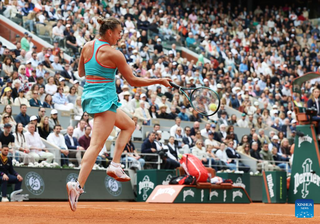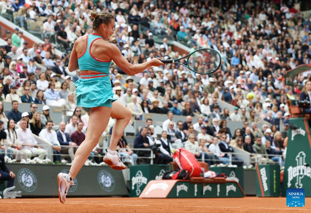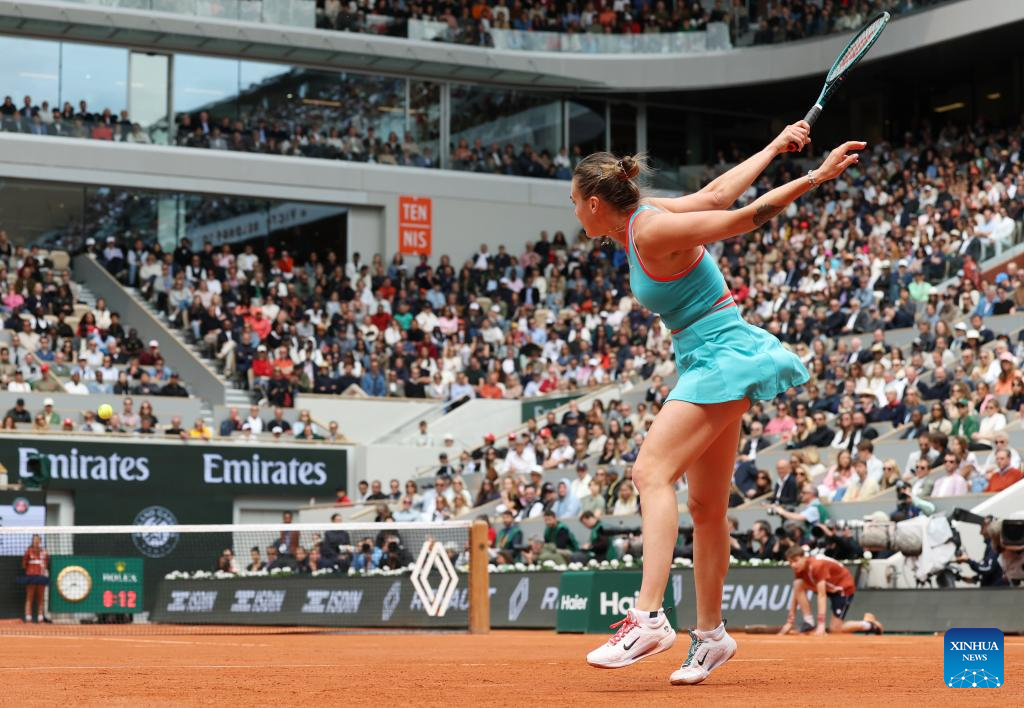 Aryna Sabalenka returns a shot during the women's singles final match between Aryna Sabalenka of Belarus and Coco Gauff of the United States at the French Open tennis tournament at Roland Garros, Paris, France, June 7, 2025. (Xinhua/Gao Jing)