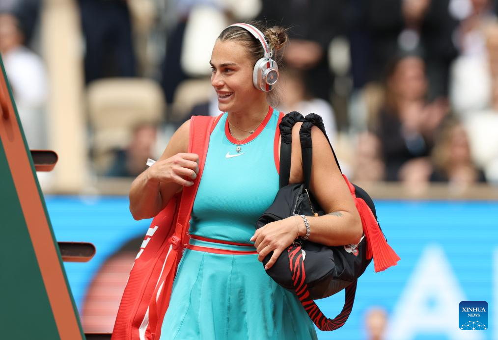 Aryna Sabalenka enters the court before the women's singles final match between Aryna Sabalenka of Belarus and Coco Gauff of the United States at the French Open tennis tournament at Roland Garros, Paris, France, June 7, 2025. (Xinhua/Gao Jing)