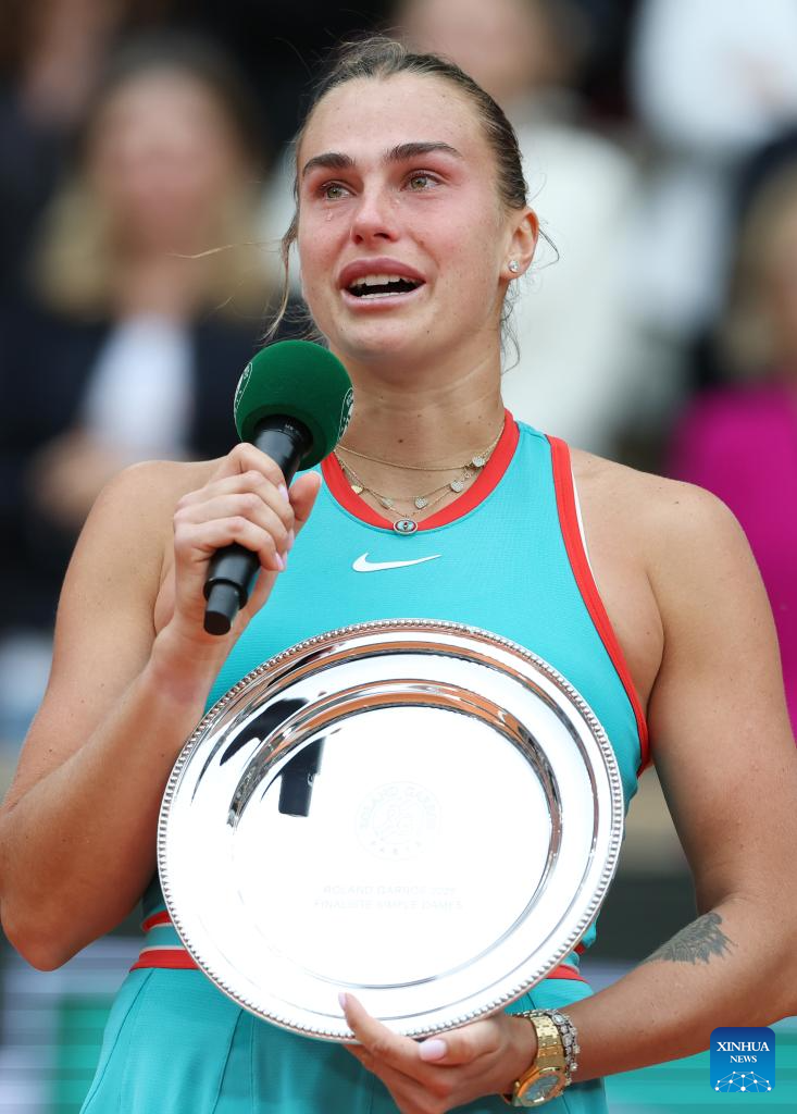 Aryna Sabalenka speaks during the awarding ceremony for the women's singles at the French Open tennis tournament at Roland Garros, Paris, France, June 7, 2025. (Xinhua/Gao Jing)