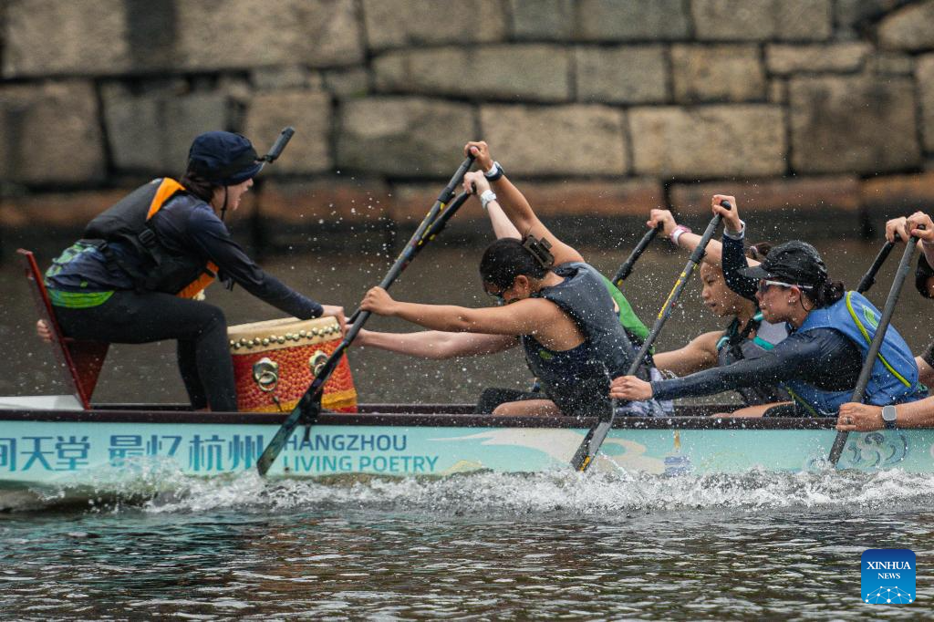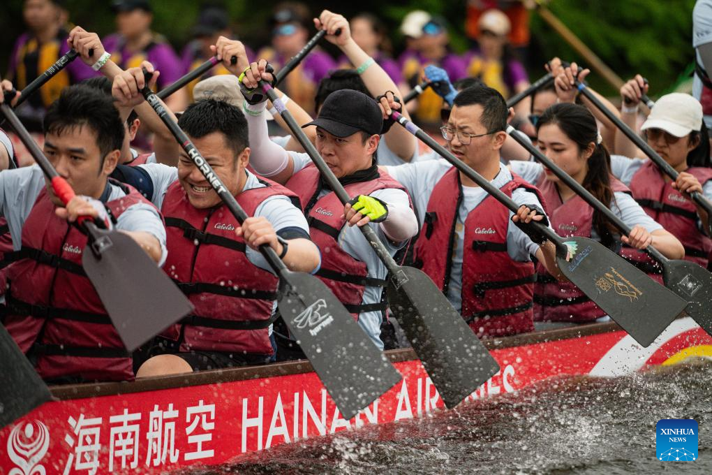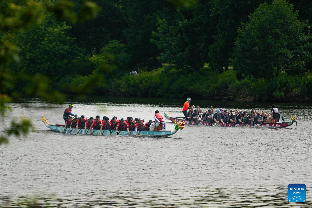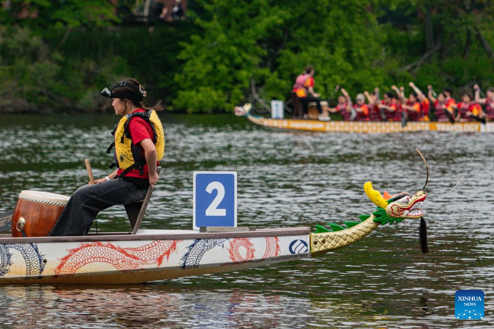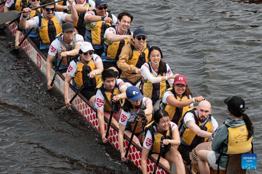 Participants compete at the Boston Dragon Boat Festival in Cambridge, Massachusetts, the United States, on June 8, 2025. (Photo by Ziyu Julian Zhu/Xinhua)