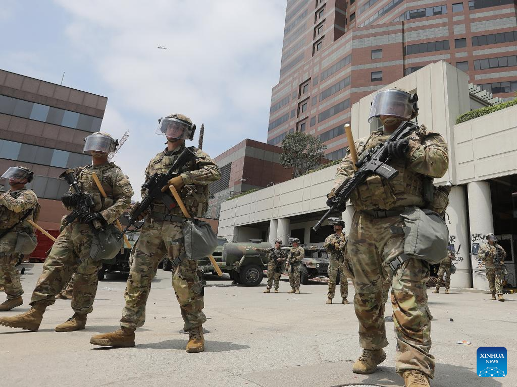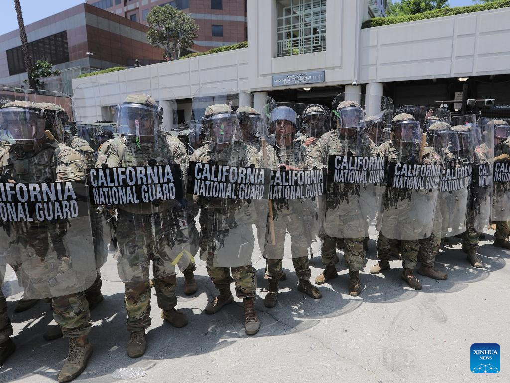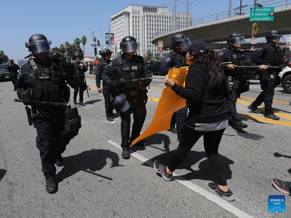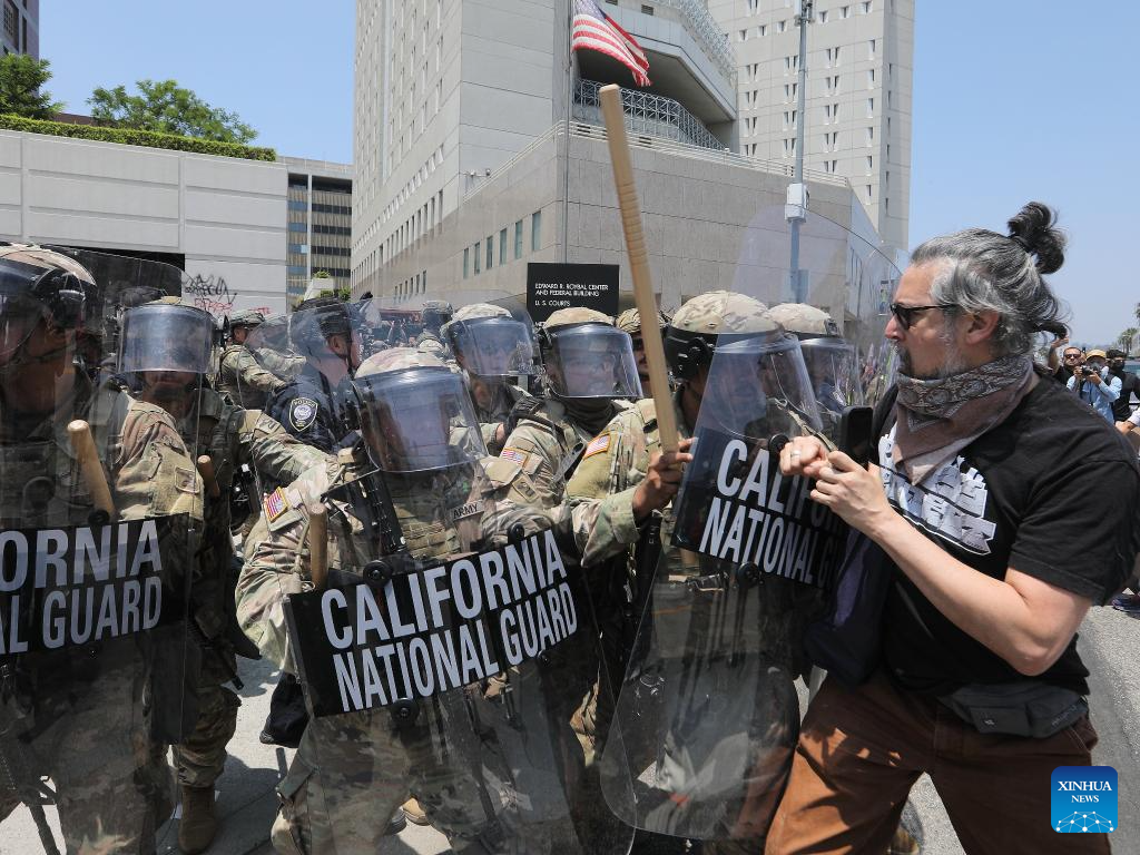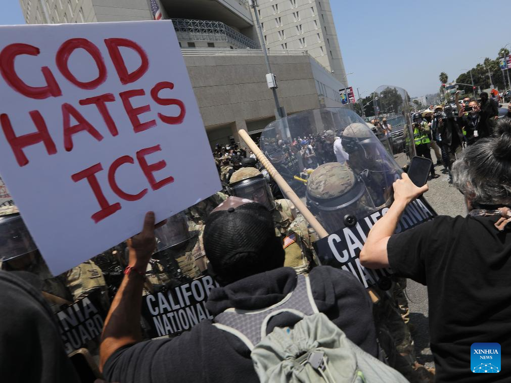 LOS ANGELES, June 8 (Xinhua) -- More than 1,000 protesters clashed and faced off with National Guard troops in downtown Los Angeles on Sunday during the latest demonstrations against immigration raids that swept across California over the weekend.