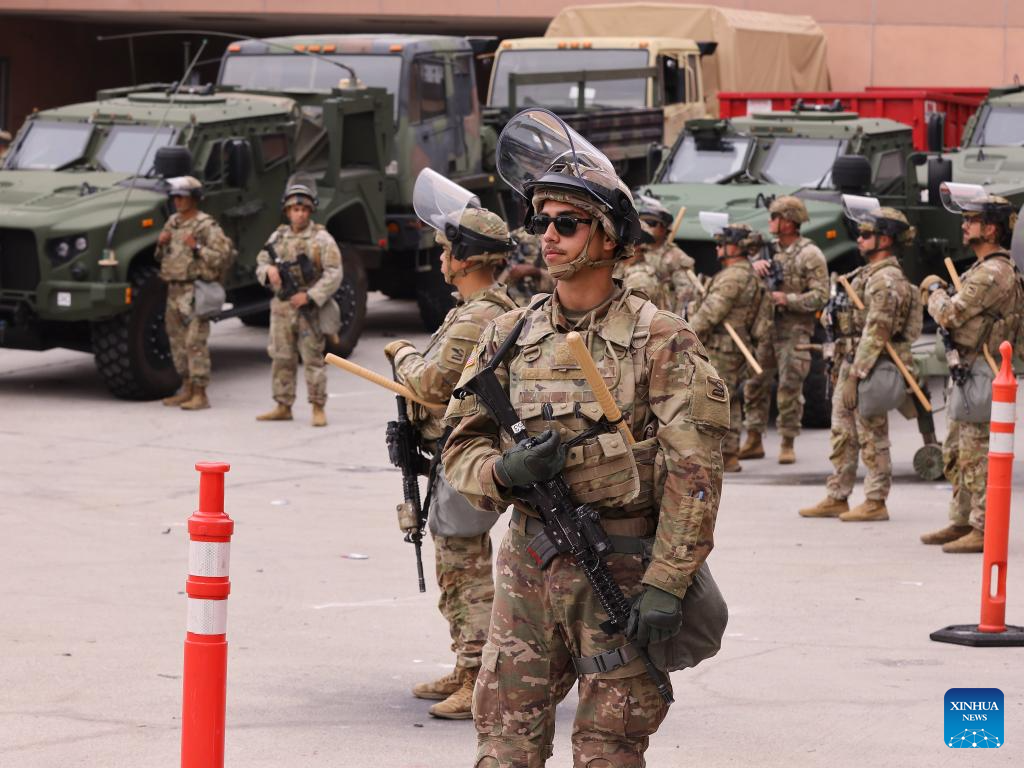 The California National Guard soldiers stand guard at the Los Angeles Federal Detention Center, in Los Angeles, California, the United States, June 8, 2025. More than 1,000 protesters clashed and faced off with National Guard troops in downtown Los Angeles on Sunday during the latest demonstrations against immigration raids that swept across California over the weekend. (Photo by Qiu Chen/Xinhua)