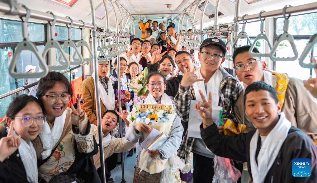 Students take a bus to leave after the exam at a national college entrance examination site in Lhasa, southwest China's Xizang Autonomous Region, June 9, 2025. China's national college entrance exam, also known as the gaokao, began on June 7 this year. The exam in some regions has ended on Monday. (Xinhua/Tenzin Nyida)