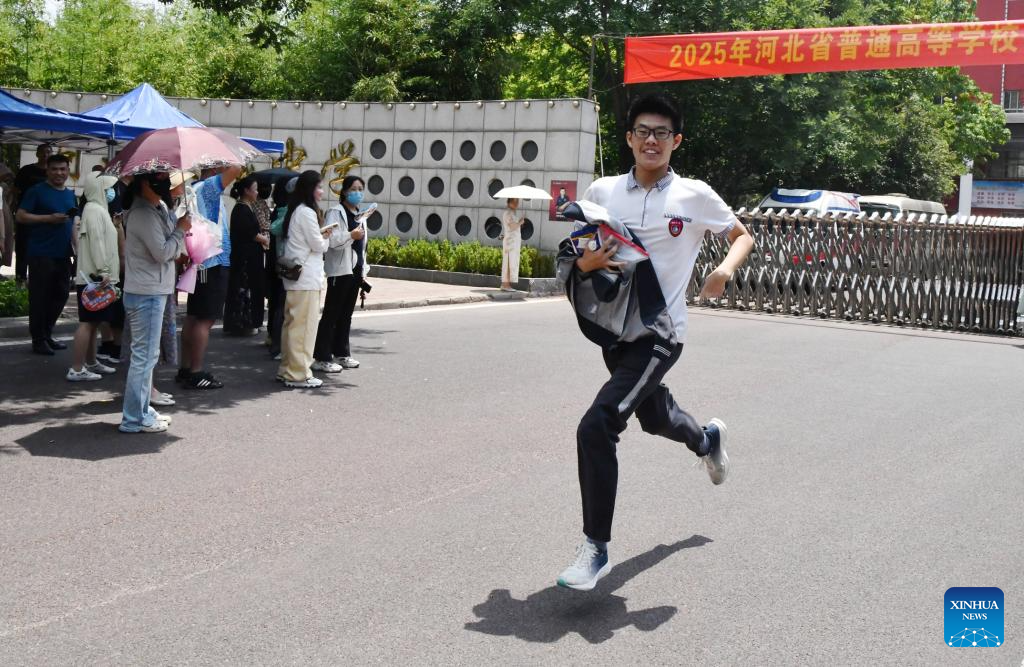 A student runs out of a national college entrance examination site in Shijiazhuang City, north China's Hebei Province, June 9, 2025. China's national college entrance exam, also known as the gaokao, began on June 7 this year. The exam in some regions has ended on Monday. (Photo by Li Mingfa/Xinhua)