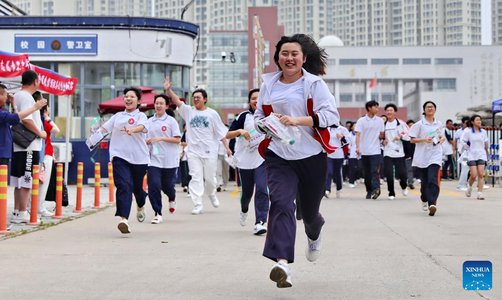 Students run out of a national college entrance examination site in Qinhuangdao City, north China's Hebei Province, June 9, 2025. China's national college entrance exam, also known as the gaokao, began on June 7 this year. The exam in some regions has ended on Monday. (Photo by Cao Jianxiong/Xinhua)