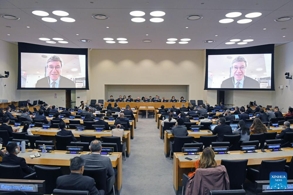 U.S. economist Jeffrey Sachs (on the screens), speaks via video link during a UN event to mark the first anniversary of the International Day for Dialogue Among Civilizations at the UN headquarters in New York, June 9, 2025. (Xinhua/Li Rui)