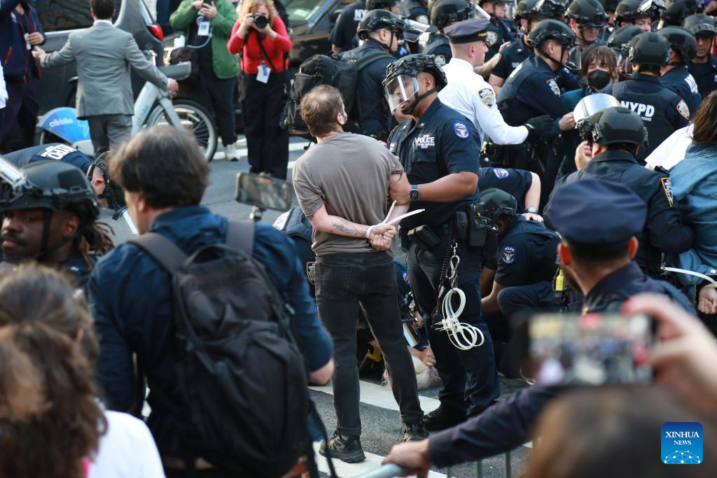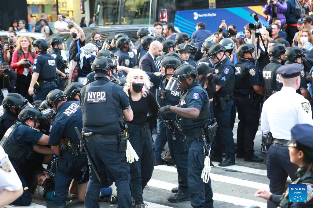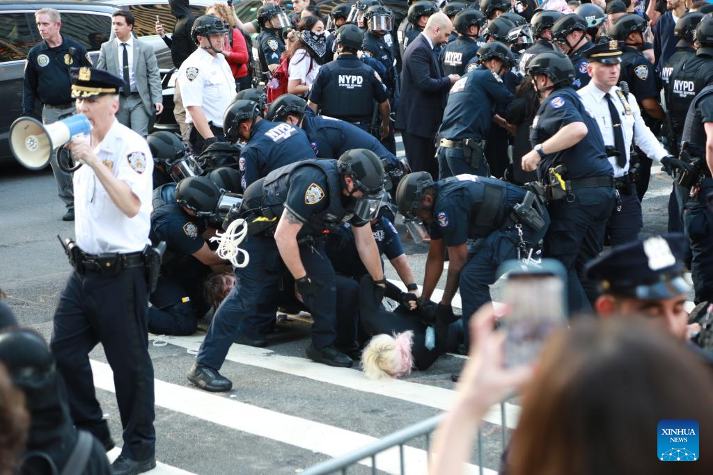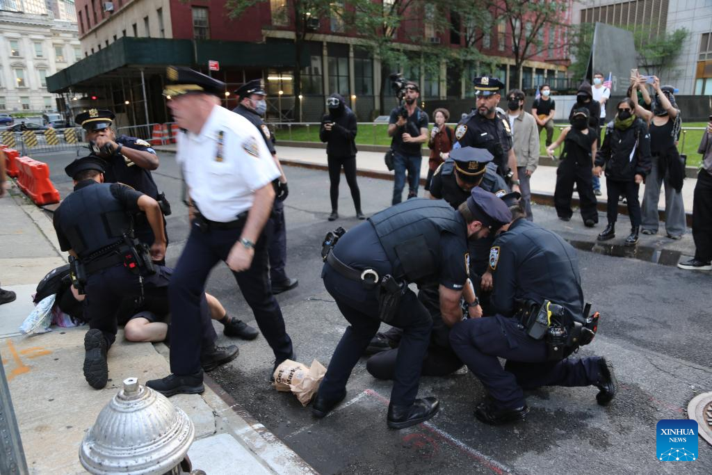 Police officers detain anti-ICE protesters around Federal Plaza Immigration Court in Lower Manhattan, New York City, the United States, on June 10, 2025. Hundreds of demonstrators gathered in Lower Manhattan, New York on Tuesday evening to protest against intensified deportations by U.S. Immigration and Customs Enforcement (ICE), as coordinated actions unfolded across the country in solidarity with protests in Los Angeles. (Xinhua/Liu Yanan)