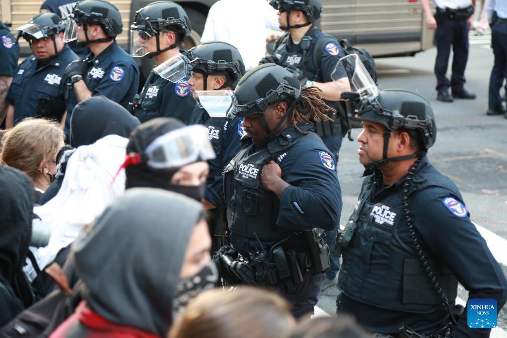 Police officers confront with anti-ICE protesters around Federal Plaza Immigration Court in Lower Manhattan, New York City, the United States, on June 10, 2025. Hundreds of demonstrators gathered in Lower Manhattan, New York on Tuesday evening to protest against intensified deportations by U.S. Immigration and Customs Enforcement (ICE), as coordinated actions unfolded across the country in solidarity with protests in Los Angeles. (Xinhua/Liu Yanan)