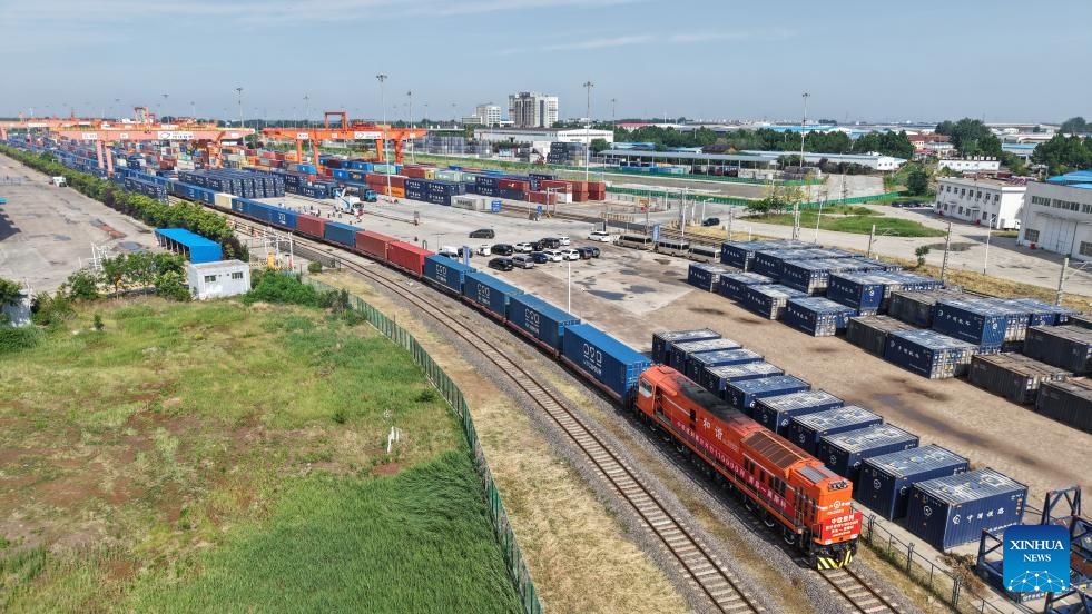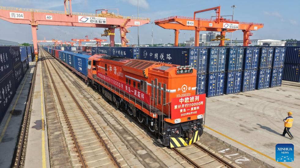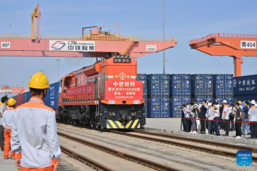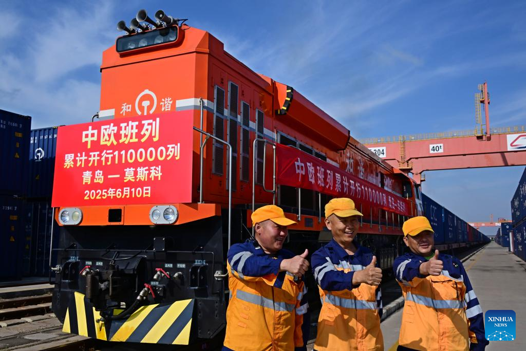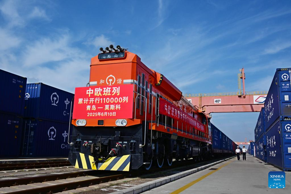 This photo shows the 110,000th China-Europe freight train bound for Moscow of Russia, departing from Jiaozhou Railway Station in Qingdao, east China's Shandong Province, June 10, 2025. The 110,000th China-Europe freight train departed from Qingdao on Tuesday morning, marking a milestone in the service's high-quality development.