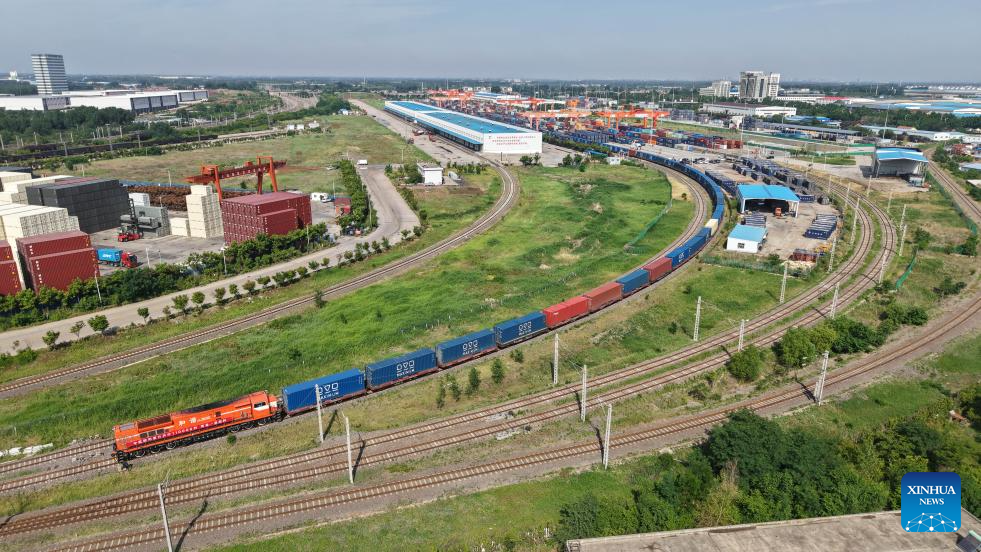 An aerial drone photo shows the 110,000th China-Europe freight train departing from Jiaozhou Railway Station in Qingdao, east China's Shandong Province, June 10, 2025. The 110,000th China-Europe freight train departed from Qingdao on Tuesday morning, marking a milestone in the service's high-quality development.