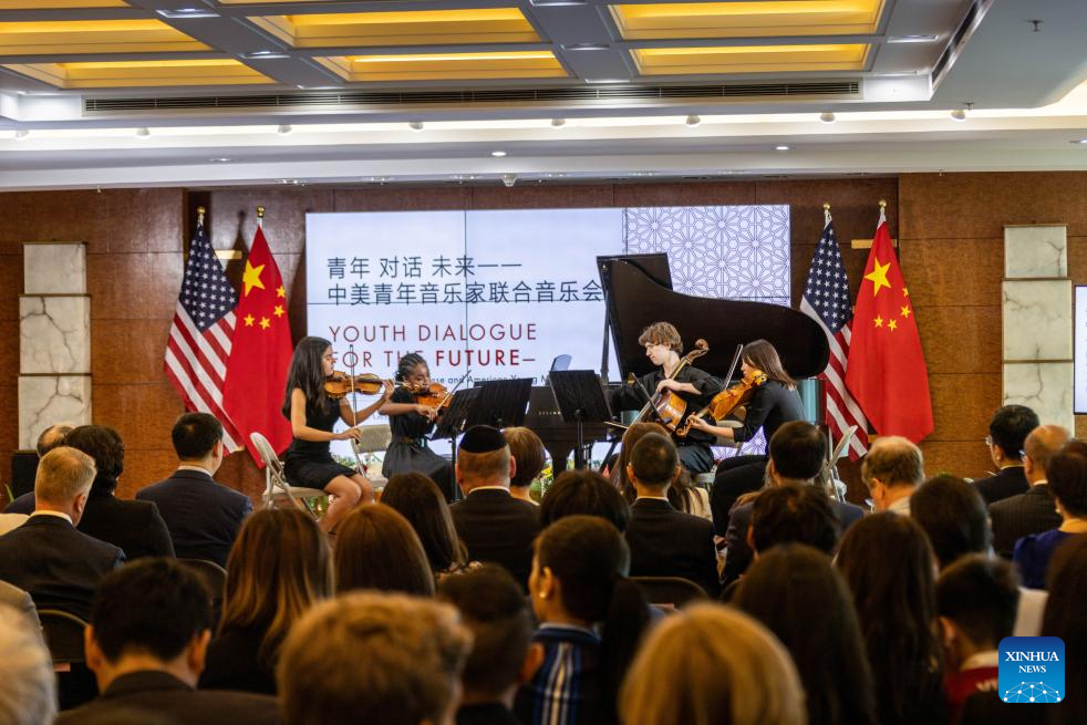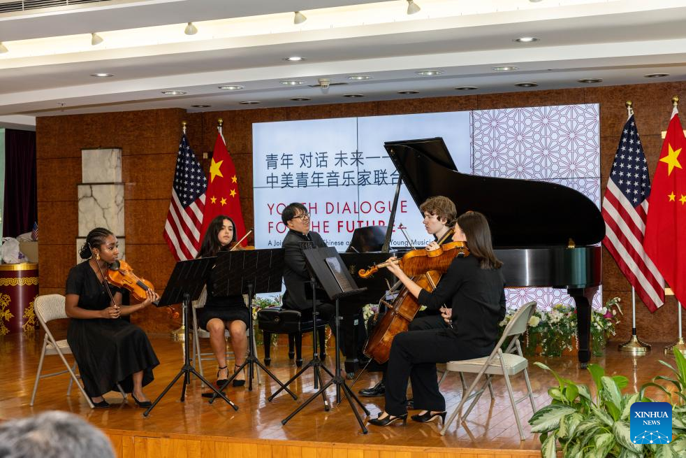 Young musicians perform at an event titled "Youth Dialogue for the Future" in New York City, the United States, on June 12, 2025. Young musicians from China and the United States Thursday jointly performed to an audience of around 200 guests at the Chinese Consulate General in New York. The event, titled "Youth Dialogue for the Future," focused on collaboration and diplomacy of the two countries. (Photo by Winston Zhou/Xinhua)
