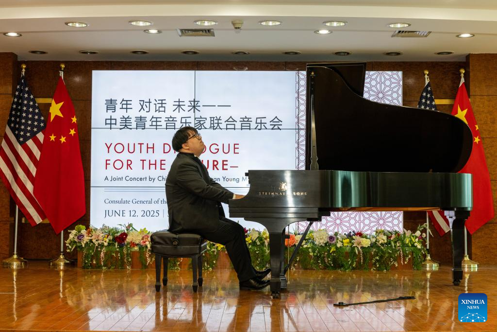 Wei Zijian, an award-winning pianist from China and winner of the prestigious Cleveland International Piano Competition, performs at an event titled "Youth Dialogue for the Future" in New York City, the United States, on June 12, 2025. Young musicians from China and the United States Thursday jointly performed to an audience of around 200 guests at the Chinese Consulate General in New York. The event, titled "Youth Dialogue for the Future," focused on collaboration and diplomacy of the two countries. (Photo by Winston Zhou/Xinhua)
