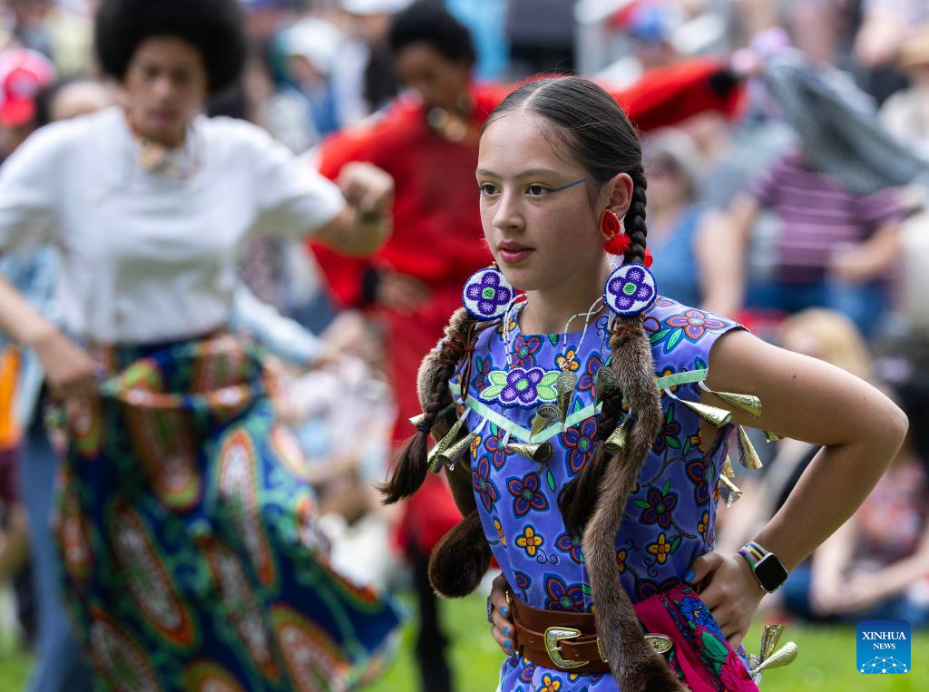 A girl dressed in indigenous costume dances during a celebration marking National Indigenous Peoples Day in Toronto, Canada, June 21, 2025. (Photo by Zou Zheng/Xinhua)