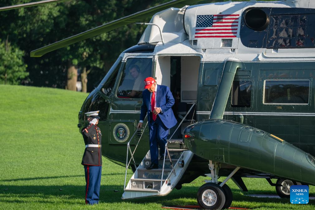 U.S. President Donald Trump steps off Marine One upon his return to the White House in Washington, D.C., the United States, on June 21, 2025. Trump said Saturday that the United States has completed attacks on three nuclear sites in Iran, including "Fordow, Natanz and Esfahan."