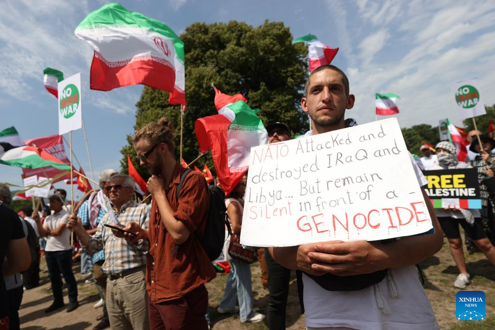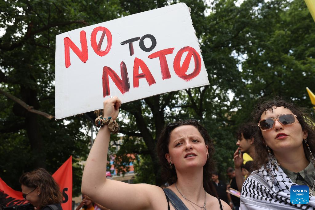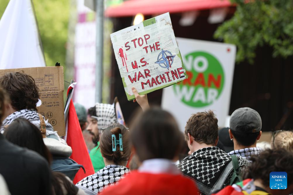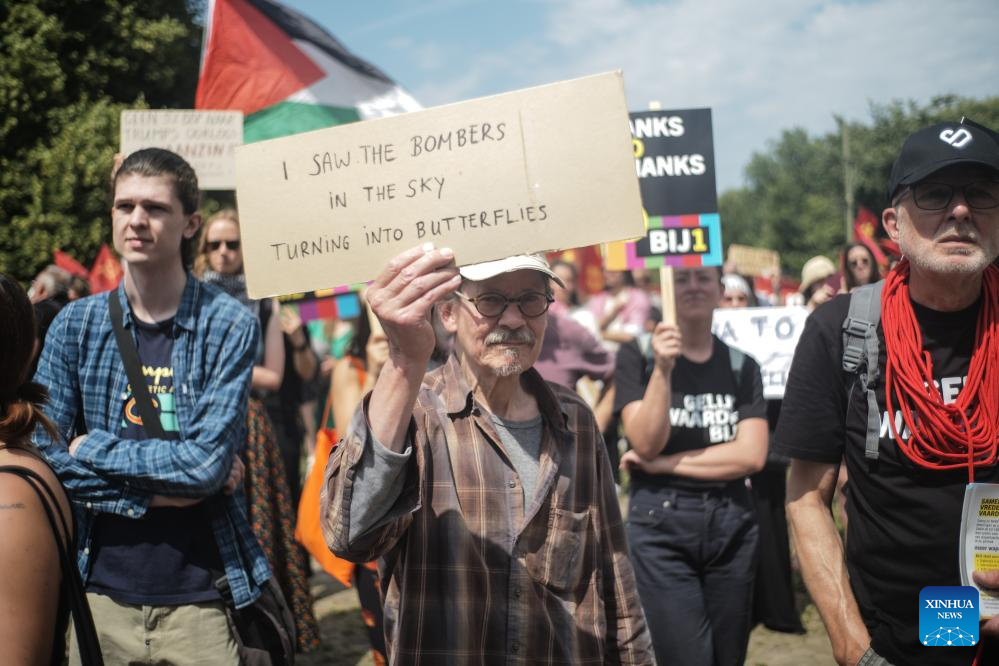 The protest, attended by hundreds, took place two days before the NATO summit, where member states are expected to push for increased defense spending. While the demonstration was billed as opposing NATO and the war in Gaza, it also drew participants holding banners reading "No Iran War," following U.S. airstrikes on three of Iran's nuclear facilities a day earlier.(Xinhua/Peng Ziyang)