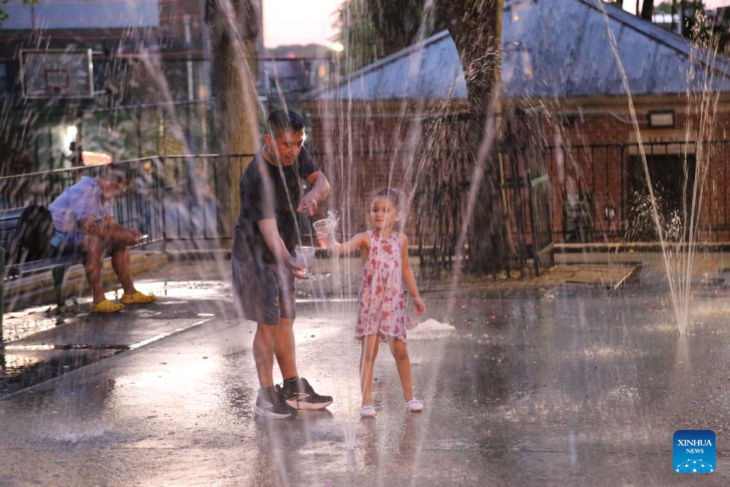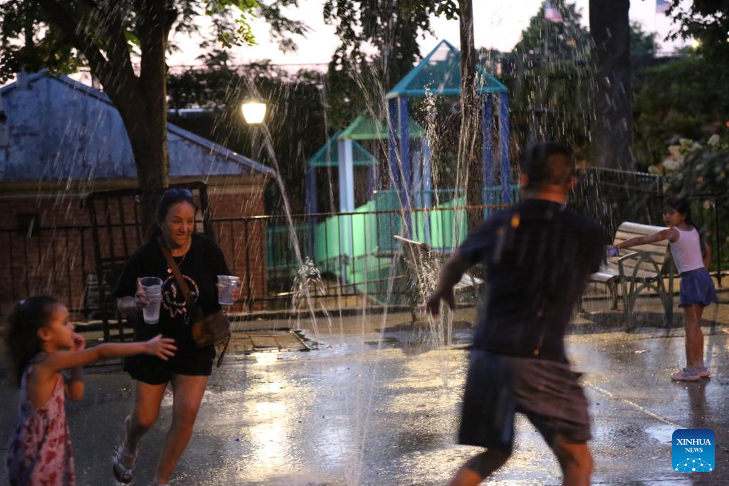 People play with water at a fountain in a park in Queens borough, New York City, the United States, June 24, 2025. New York State Governor Kathy Hochul has declared a state of emergency in as many as 32 counties in response to severe weather and extreme heat. New York state is expected to undergo a multi-day heat wave from Sunday to Wednesday. (Xinhua/Liu Yanan)