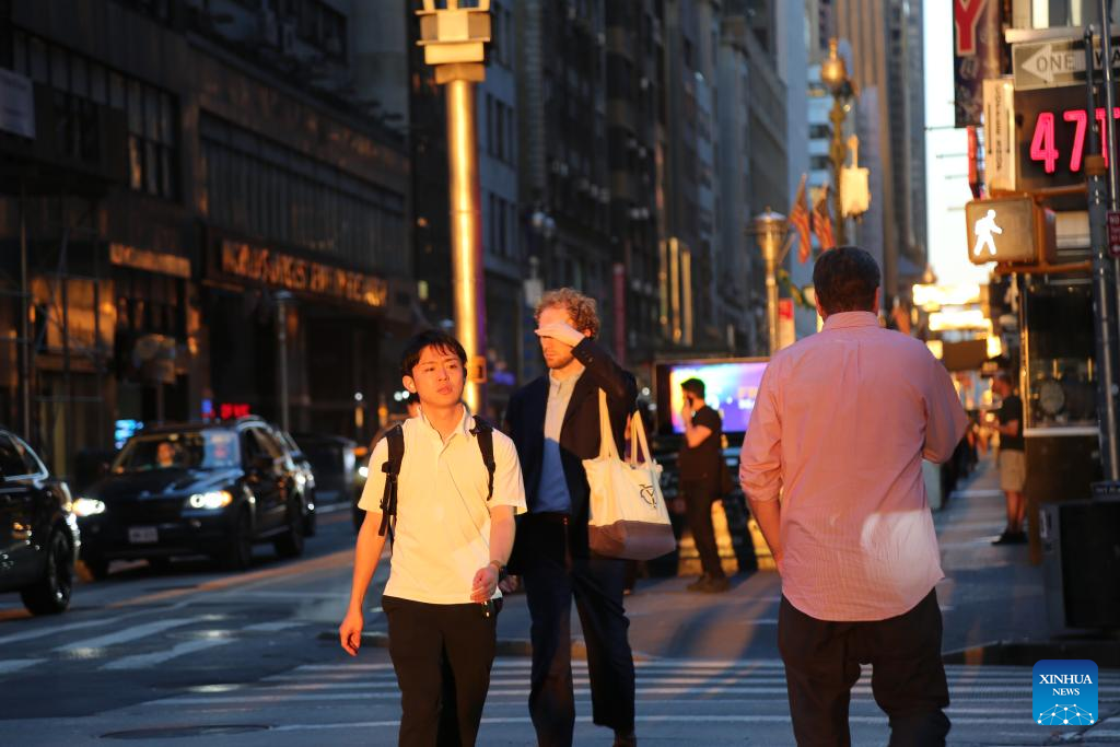 Pedestrians walk across the 6th Avenue in Manhattan, New York City, the United States, June 24, 2025. New York State Governor Kathy Hochul has declared a state of emergency in as many as 32 counties in response to severe weather and extreme heat. New York state is expected to undergo a multi-day heat wave from Sunday to Wednesday. (Xinhua/Liu Yanan)