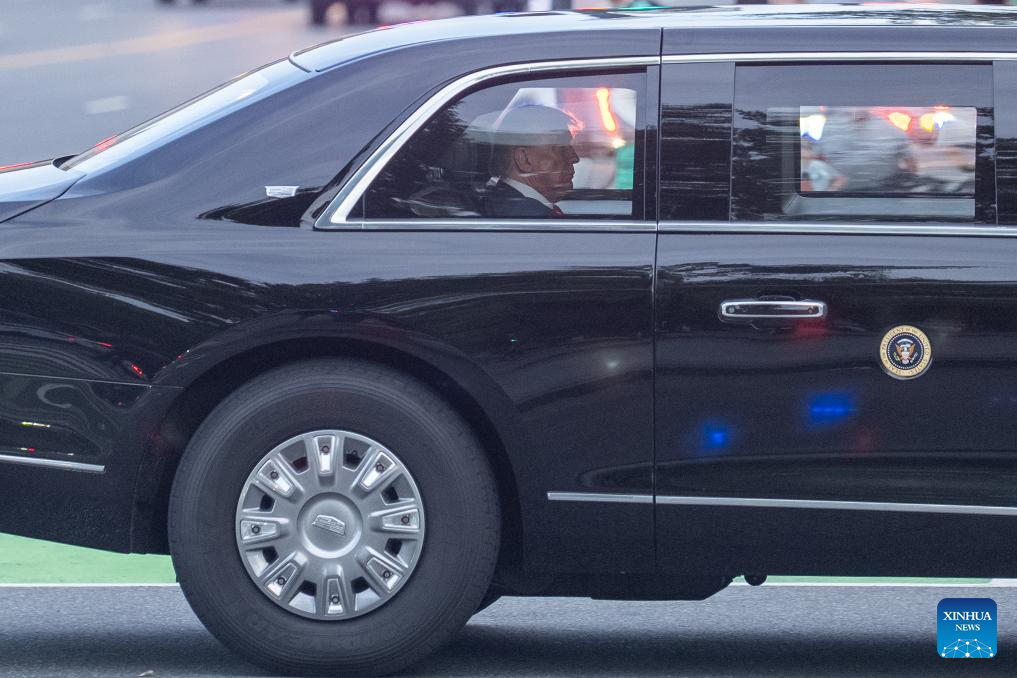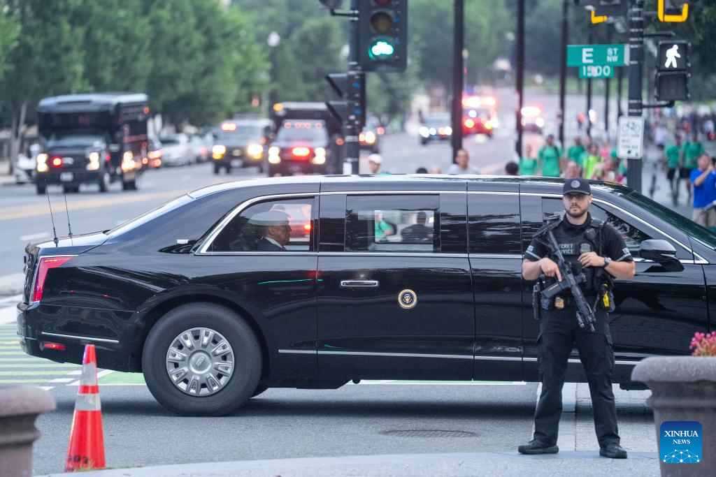 U.S. President Donald Trump, who has just attended the NATO summit, is pictured in a car on his way back to the White House in Washington, D.C., the United States, June 25, 2025. Trump on Wednesday urged Congress to "kill" the Voice of America, marking his administration's second attempt since his return to office. (Xinhua/Hu Yousong)