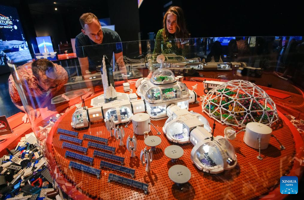 Visitors look at a LEGO model of a Mars habitat design during the "Artemis Space Adventure with LEGO Bricks" exhibition at Science World in Vancouver, British Columbia, Canada, June 26, 2025. The exhibition kicked off here on Thursday and runs until April 6, 2026. (Photo by Harrison Ha/Xinhua)