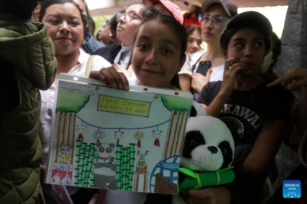 A child displays a panda-themed painting at Chapultepec Zoo in Mexico City, capital of Mexico, on June 29, 2025. The celebration for giant panda Xin Xin's 35th birthday was held here on Sunday. The festivities included a traditional lion dance, an exhibition of panda-themed artwork, and a birthday cake ceremony, which drew large crowds in a lively atmosphere.
