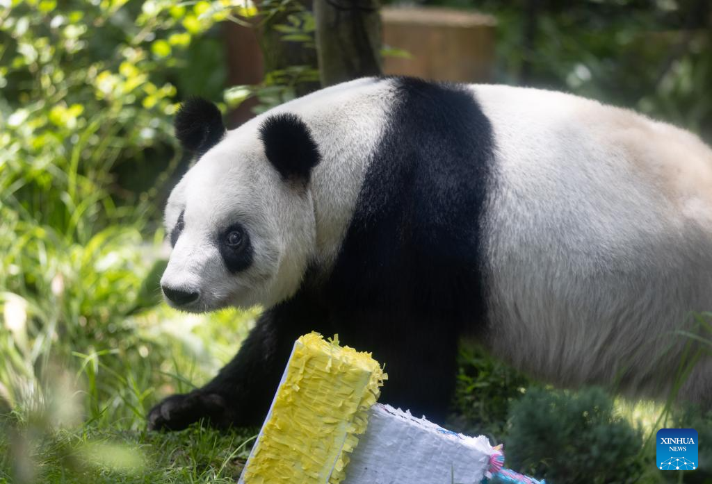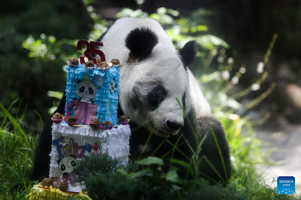 Giant panda Xin Xin enjoys her birthday party at Chapultepec Zoo in Mexico City, capital of Mexico, on June 29, 2025. The celebration for giant panda Xin Xin's 35th birthday was held here on Sunday. The festivities included a traditional lion dance, an exhibition of panda-themed artwork, and a birthday cake ceremony, which drew large crowds in a lively atmosphere.