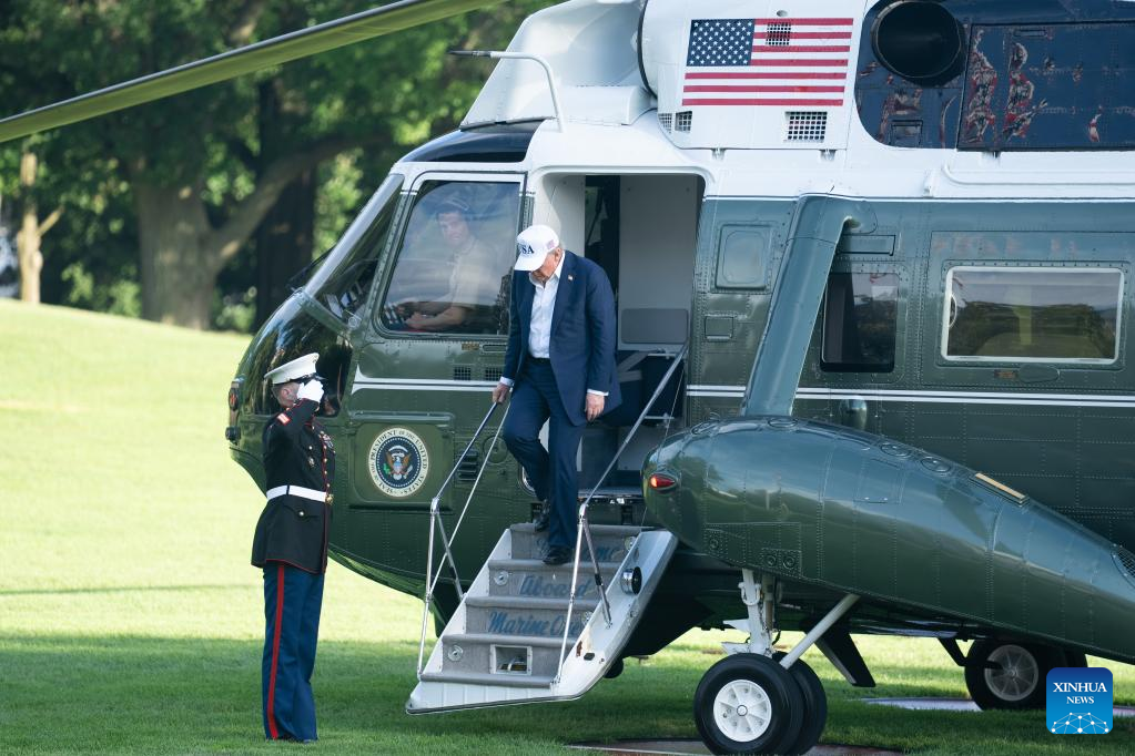 U.S. President Donald Trump steps off Marine One upon his return to the White House in Washington, D.C., the United States, July 6, 2025. (Xinhua/Hu Yousong)