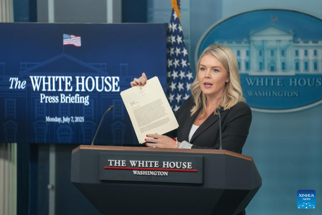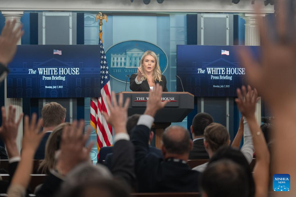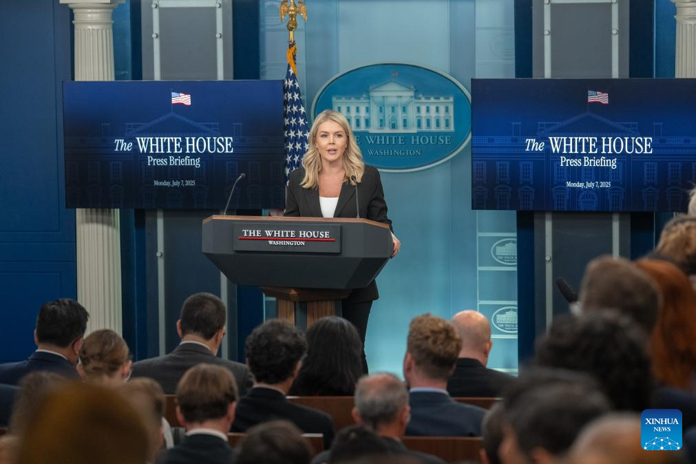 White House Press Secretary Karoline Leavitt takes questions during a press briefing at the White House in Washington, D.C., the United States, on July 7, 2025. Leavitt said Monday afternoon that U.S. President Donald Trump plans to issue an executive order to extend the pause on "reciprocal tariffs" from July 9 to Aug. 1. (Xinhua/Hu Yousong)