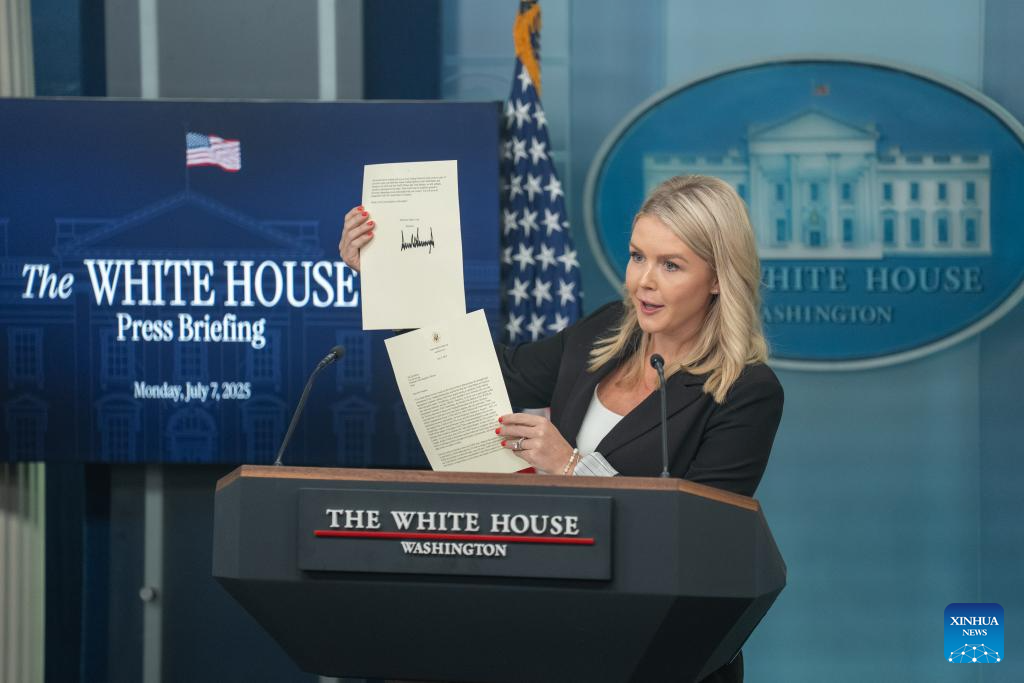 White House Press Secretary Karoline Leavitt showcases U.S. President Donald Trump's letter to the president of the Republic of Korea during a press briefing at the White House in Washington, D.C., the United States, on July 7, 2025. Leavitt said Monday afternoon that U.S. President Donald Trump plans to issue an executive order to extend the pause on "reciprocal tariffs" from July 9 to Aug. 1. (Xinhua/Hu Yousong)