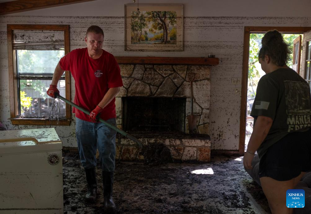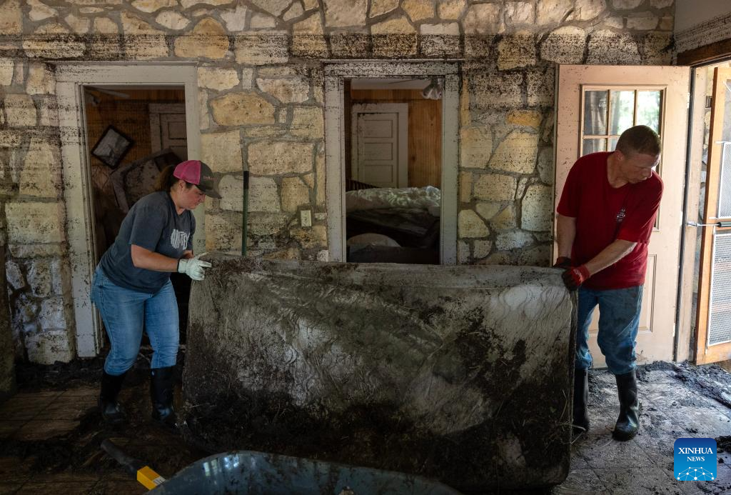 People clean up a house after the flood in Hunt, Texas, the United States, July 11, 2025.