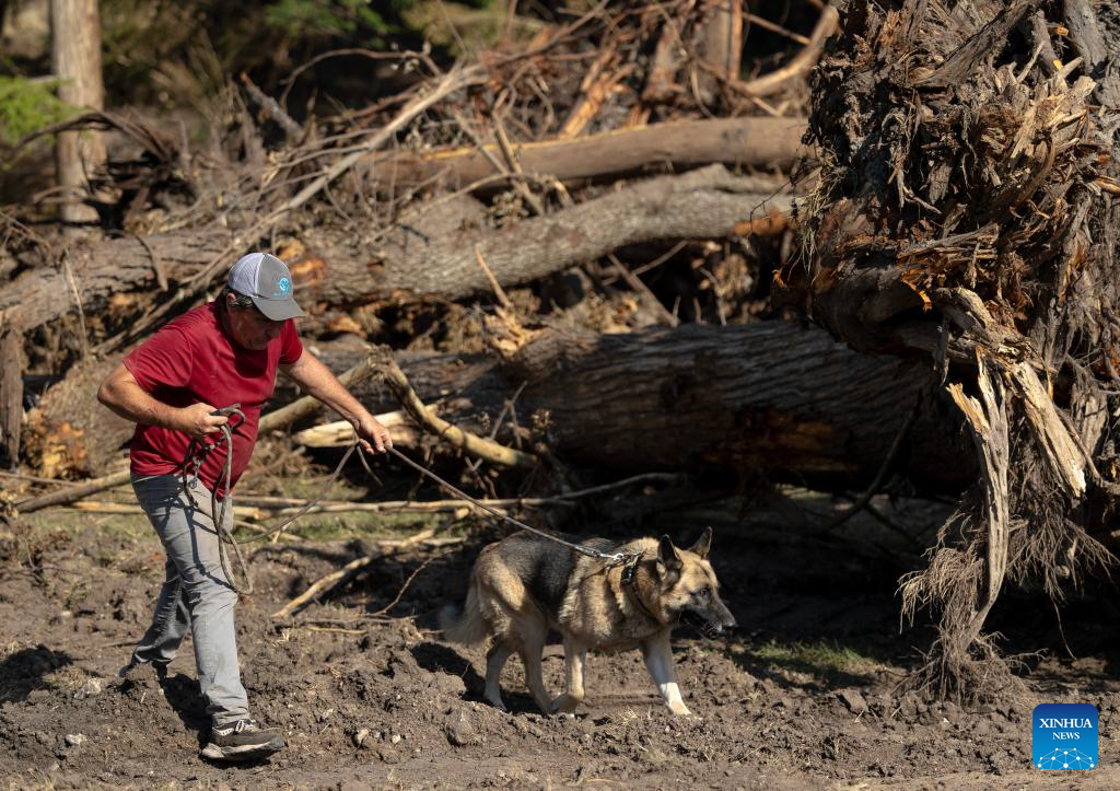 A man and a cadaver dog search for victims in Hunt, Texas, the United States, July 11, 2025.