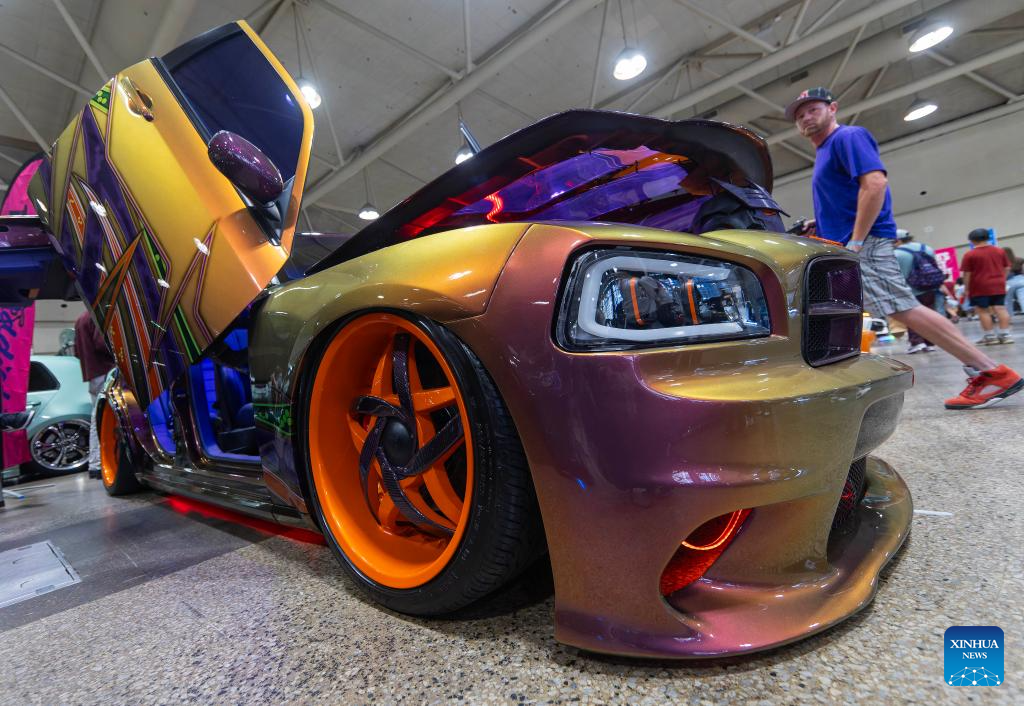 People look at a modified vehicle during the 2025 ImportFest in Toronto, Canada, on July 12, 2025. Showcasing hundreds of modified vehicles from across Canada and the United States, the annual one-day event was held here on Saturday. (Photo by Zou Zheng/Xinhua)