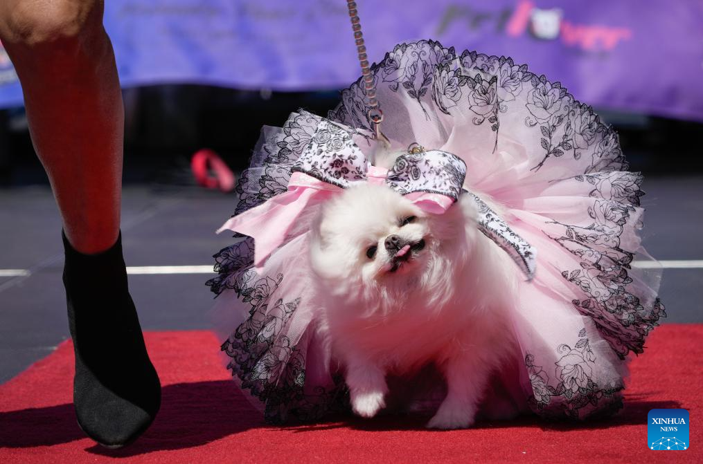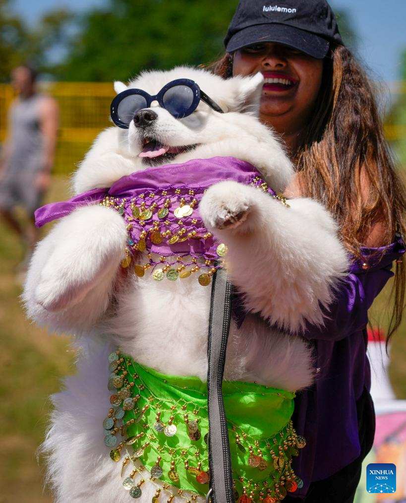 Dressed up dogs are seen during a dog fashion show in Vancouver, Canada, July 12, 2025. An outdoor pet festival kicked off here on Saturday, featuring a dog fashion show. (Photo by Liang Sen/Xinhua)