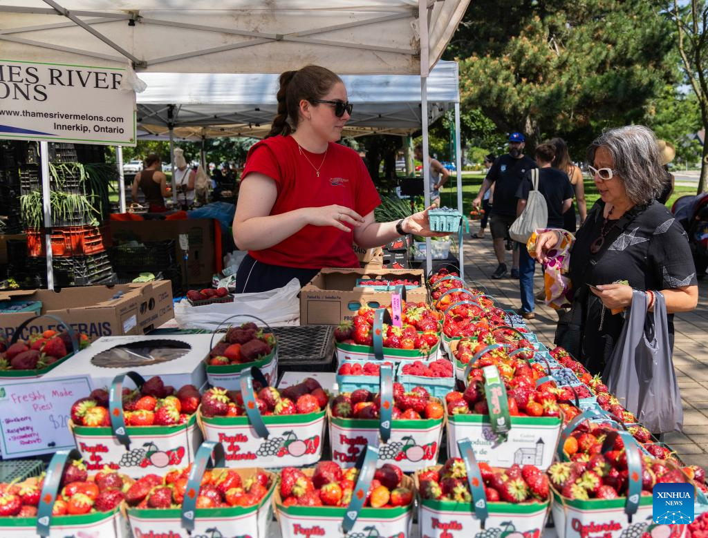 A customer shops for fruit at a farmers' market in Toronto, Canada, on July 15, 2025. Canada's Consumer Price Index (CPI) rose 1.9 percent on a year-over-year basis in June, up from a 1.7 percent increase in May, Statistics Canada said Tuesday. (Photo by Zou Zheng/Xinhua)