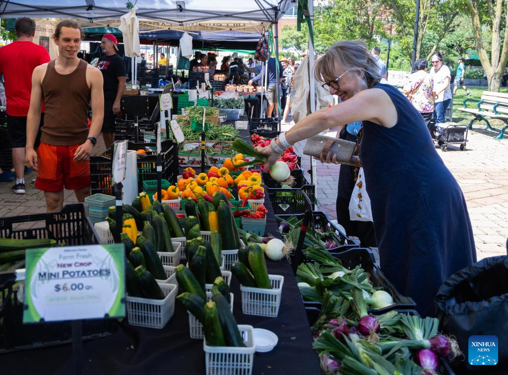Customers shop for groceries at a farmers' market in Toronto, Canada, on July 15, 2025. Canada's Consumer Price Index (CPI) rose 1.9 percent on a year-over-year basis in June, up from a 1.7 percent increase in May, Statistics Canada said Tuesday. (Photo by Zou Zheng/Xinhua)