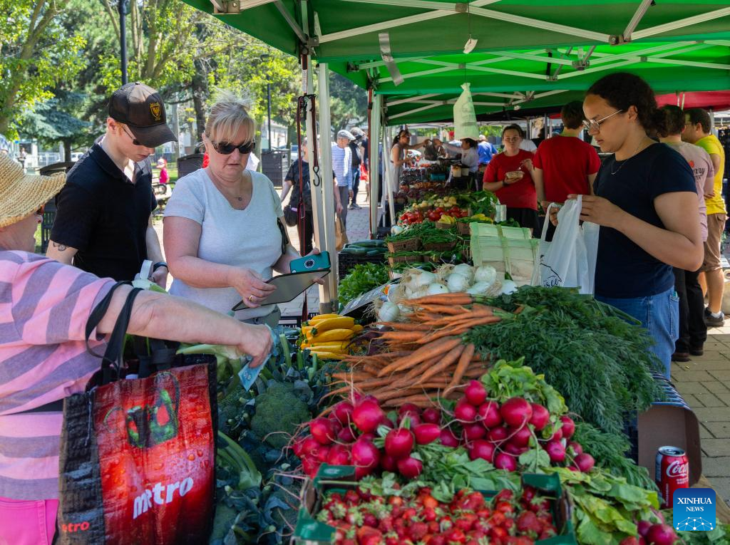 A customer shops for groceries at a farmers' market in Toronto, Canada, on July 15, 2025. Canada's Consumer Price Index (CPI) rose 1.9 percent on a year-over-year basis in June, up from a 1.7 percent increase in May, Statistics Canada said Tuesday. (Photo by Zou Zheng/Xinhua)