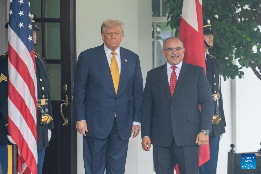 U.S. President Donald Trump (L) welcomes Bahrain's Crown Prince and Prime Minister Salman bin Hamad Al Khalifa at the White House in Washington, D.C., the United States, on July 16, 2025. U.S. President Donald Trump on Wednesday unveiled a plan to impose a unified tariff rate on more than 150 countries and regions, according to a report by Politico.