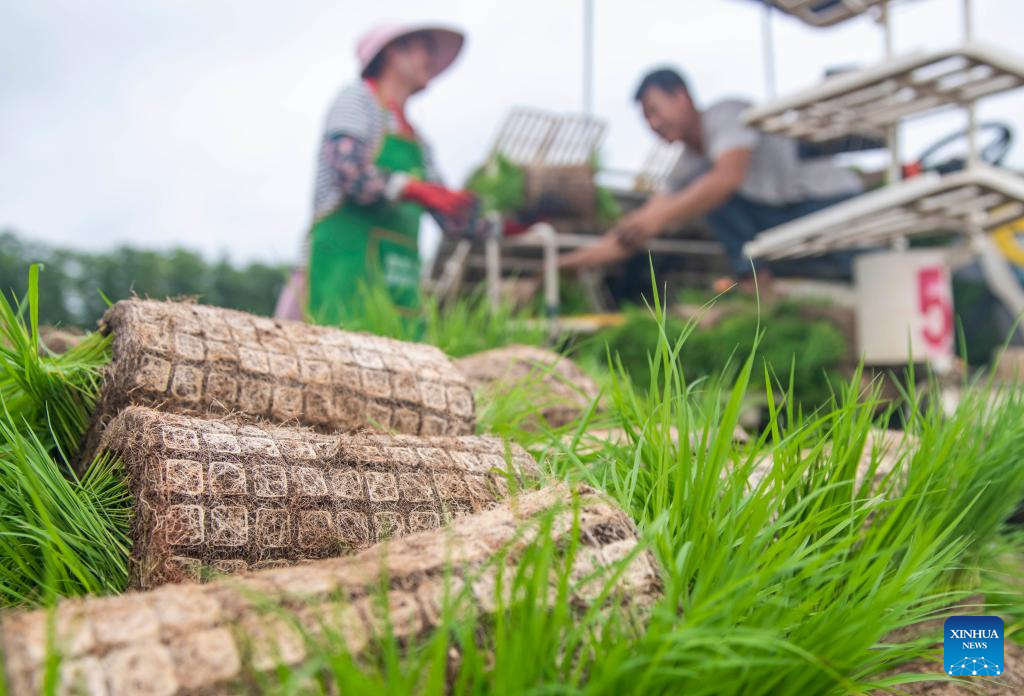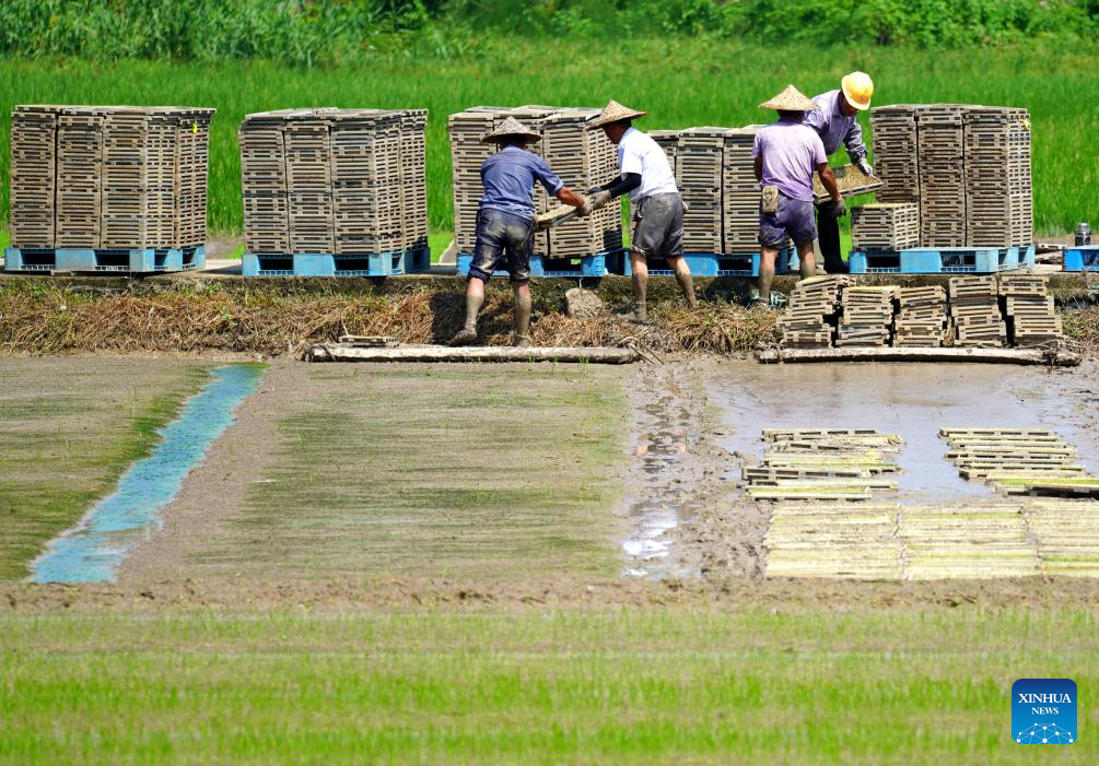 Villagers transport rice seedlings onto the rice transplanter in Meihua Town of Daoxian County in Yongzhou City, central China's Hunan Province, July 14, 2025. (Photo by Jiang Keqing/Xinhua)