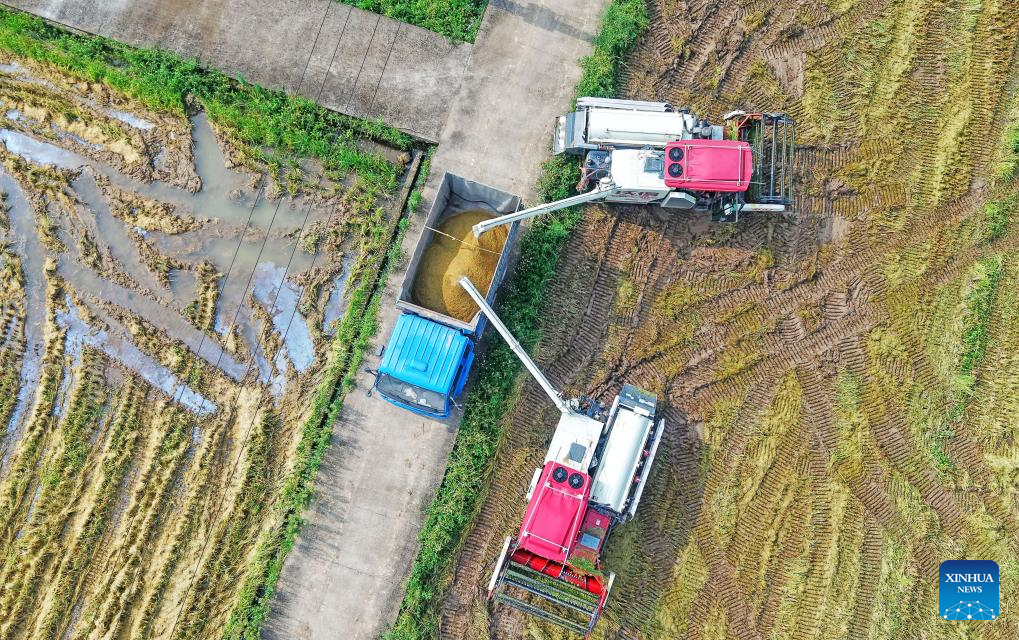 An aerial drone photo taken on July 15, 2025 shows villagers loading harvested rice in a field in Xiage Town of Xianju County, Taizhou City of east China's Zhejiang Province. (Photo by Wang Huabin/Xinhua)